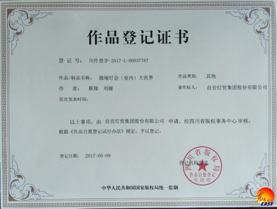 近日,我公司向四川省版權局申請的包括《微縮燈會(室內)大世界》、《青花廣場》、《皮影戲》等在內的27件作品通過版權審核,獲得國家版權登記。