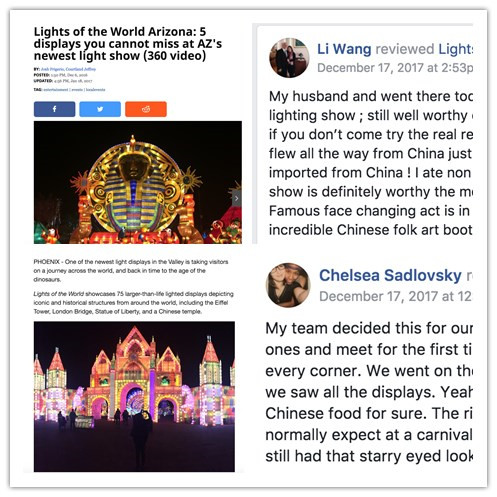 本次燈展是東方彩燈繼2016第一次成功舉辦美國(guó)菲尼克斯彩燈嘉年華的再次完美呈現(xiàn)。2017美國(guó)菲尼克斯彩燈嘉年華,自開(kāi)展以來(lái)備受美國(guó)當(dāng)?shù)孛癖姛崤鹾透鞔笾髁髅襟w關(guān)注、在facebook等社交平臺(tái)更是掀起了中國(guó)彩燈熱潮,菲尼克斯當(dāng)?shù)匦侣劇?Now @ 6 》報(bào)道稱“2017世界之光彩燈嘉年華是北美最大的彩燈節(jié),是全球文化集合地,游客仿佛置身于迪士尼中?!?