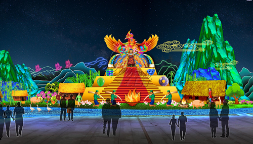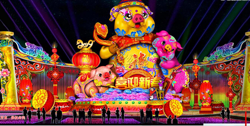 本屆太陽(yáng)節(jié)以《太陽(yáng)崇拜》、《玉米門神》等瑪雅諸神燈組,以及《夢(mèng)幻森林》、《動(dòng)物世界》里與瑪雅人息息相關(guān)的動(dòng)物燈組,與《古蜀文明》、《古蜀生活》中古蜀人漁獵農(nóng)耕和祭祀相關(guān)的燈組交相輝映。園區(qū)氛圍營(yíng)造也極具特色,瑪雅象形文字、古蜀紋飾等元素將帶領(lǐng)觀眾進(jìn)入兩大文明交匯的海洋。當(dāng)然,應(yīng)景的“年味兒”也必不可少,東方彩燈打造金沙節(jié)史上最大的立體生肖豬造型,向觀眾送上新年祝福。