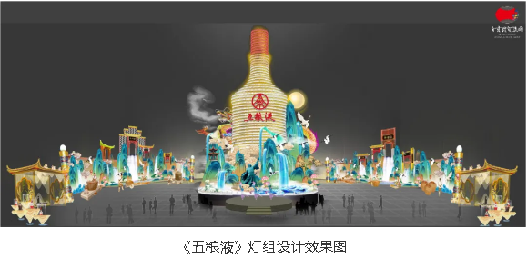 千年悠悠酒香,百年五糧精華。自貢燈貿(mào)集團(tuán)承制的大型場景式燈組《五糧液》,主燈采用第八代五糧液酒瓶運(yùn)用自貢彩燈傳統(tǒng)工藝?yán)υ删扌臀寮Z液,輔以仙山、仙境、巨龍騰越氛圍闡釋五糧傳奇,杯酒時(shí)光,百年味道。周邊群燈組展示封存在時(shí)光中的“活窖池”--利川永、張萬和、劉鼎興、天賜福、聽月樓、全恒昌等八家明代釀酒作坊,歷史悠久的古窖池群講述著傳承幾百年的五糧液釀酒工藝,折射幾千年氤氳酒香的中國酒歷史和酒文化。歲月悠悠,五糧芳香的故事將不停地續(xù)寫,在未來再創(chuàng)輝煌,歷久彌香,延綿不斷地傳承這千古佳釀。